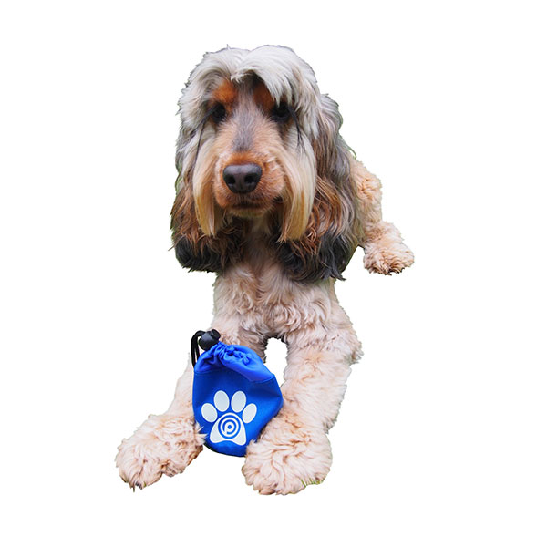 Dog treat bag Made from 600D polyester and 210D nylon Drawstring closure Velcro belt loop for easy carrying